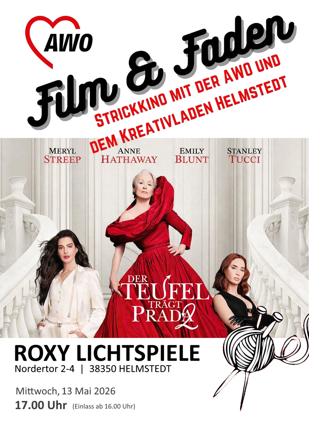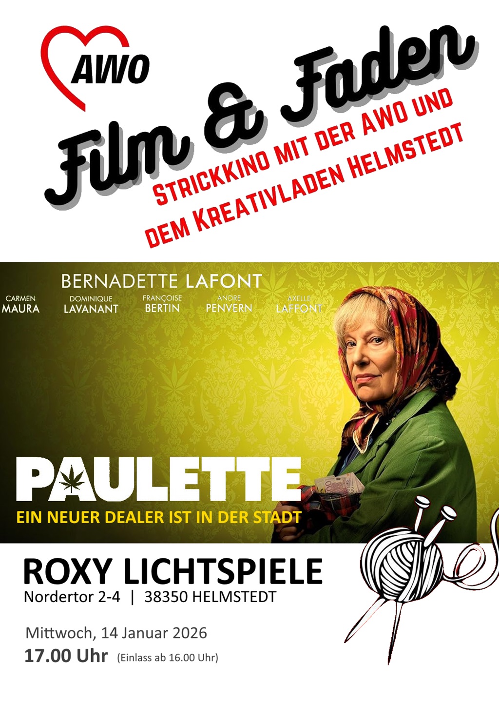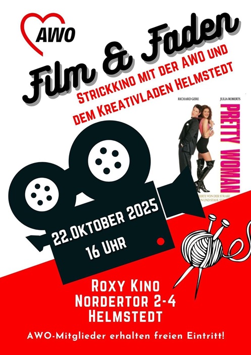 „Film & Faden“ verbindet zwei Leidenschaften: Handarbeit und Film. In entspannter Kinoatmosphäre treffen sich Menschen mit Freude am Stricken, Häkeln oder anderen Handarbeiten, um gemeinsam einen Film zu schauen – und dabei die Nadeln klappern zu lassen. Im Kinosaal bleibt das Licht so angepasst, dass bequemes Arbeiten möglich ist, ohne das Filmerlebnis zu stören. Tee, Kekse und ein liebevoll gestalteter Rahmen sorgen für Gemütlichkeit und Austausch. Die Veranstaltung wird gemeinsam mit der AWO und dem Kreativladen Helmstedt veranstaltet.